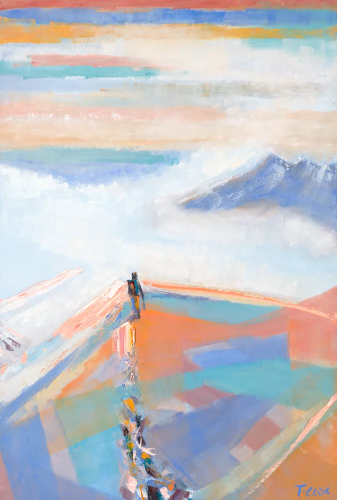 Prior to painting mountains, I was absorbed by urban landscapes and the dynamic nature of crowds. Now, after nearly a year of lockdowns my usual busy subject matter has been few and far between. The pandemic has reminded us of society’s fragilities and during this time of uncertainty, I found space to reflect in the solitude of nature. My twenties were home to a number of mountain expeditions in the Himalayas and Andes. Now I am returning to these experiences with my brushes, reminding myself of the vastness of the world beyond city walls.